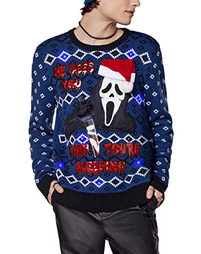 HOT ! Spencer's Light-Up Ghost Face ® He Sees You Christmas Sweater | Officially Licensed Light-Up Christmas Sweater
