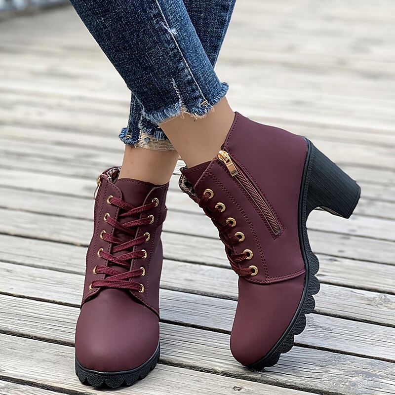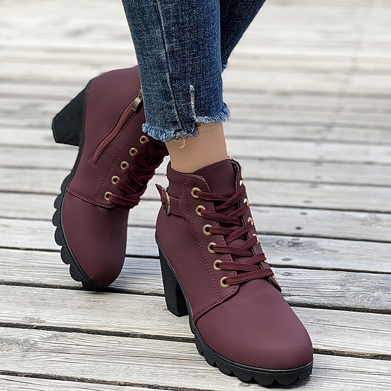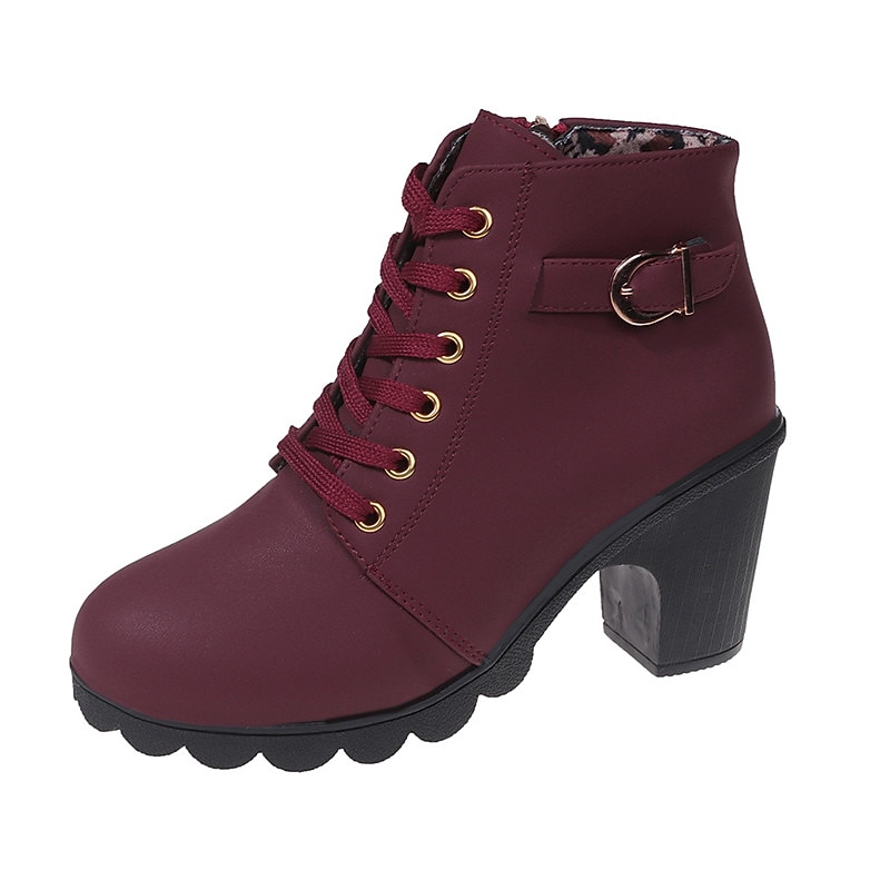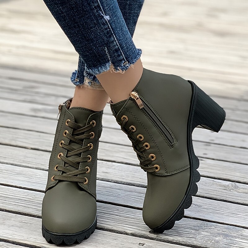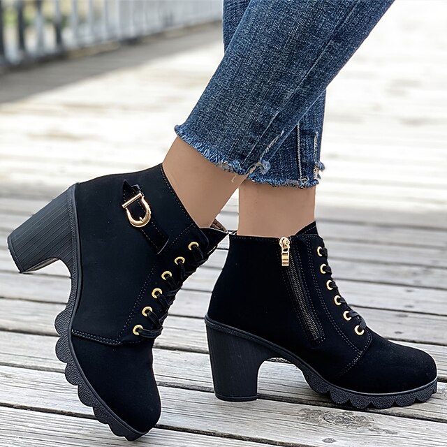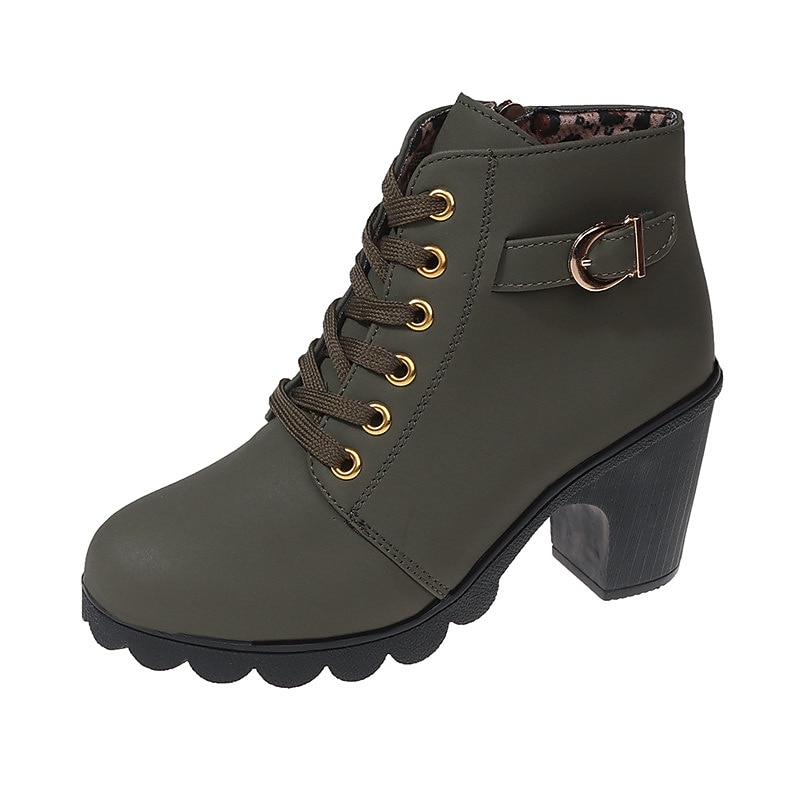 Highlights [Product Highlights] [Fabric] Crafted from high-quality PU material, these women's ankle boots offer a luxurious and durable finish. The upper materials ensure a sleek and sophisticated appearance, perfect for complementing a variety of stylish outfits. [Silhouette] Featuring a chic round toe design, these booties are set on a chunky heel that provides both stability and a comfortable lift. With a heel height of 1-2 inches, they balance fashion and function effortlessly, making them versatile for daily wear. [Design Highlights] The boots are adorned with a lace-up closure for a secure fit and added style. Decorative gold-tone eyelets and a buckle strap enhance their elegance, while the side zipper detail ensures easy wearability. Additionally, the sole boasts a unique scalloped design that not only adds a trendy touch but also provides extra grip. [Occasions] Ideal for a range of settings, from casual day-to-day activities to outdoor adventures and nighttime outings. Whether dressing up for a party or keeping it relaxed for a daily errand, these boots add a touch of charm and sophistication to any occasion. [Size Range] Available in a broad range of sizes to accommodate various needs, these boots come in US5.5 to US10, ensuring a comfortable fit for foot sizes from EU35 to EU42. Perfect for those seeking both style and practical footwear options.