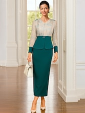 More information about Two Piece Dress Sets Mother of the Bride Dress Formal Elegant Vintage V Neck Tea Length Chiffon Long Sleeve with Color Block