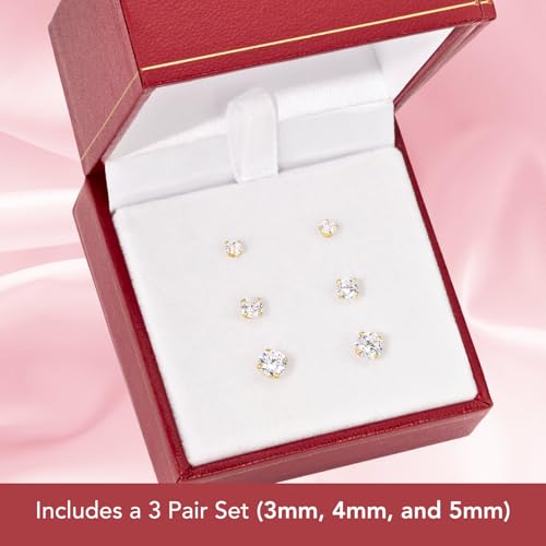 HOT ! 14k Yellow Gold Solitaire Round Cubic Zirconia CZ Stud Earrings with Gold butterfly Pushbacks - 3 Pair Set (3mm, 4mm, 5mm)