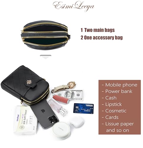 • Dimension: L 7.5"*W 1.97"* H 5.9" (19cm*5cm*15cm). The crossbody phone wallet has two zipper main pockets and One accessory bag could accommodate small belongings when you go out such as mobile phone,power bank,lipstick,make up,tissue,money,cards,passport,coin tickets etc.