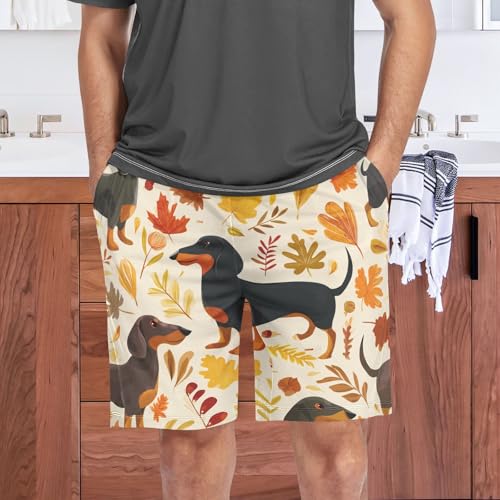 HOT ! Autumn Leaves Dachshund Print Pajama Bottom Shorts for Men Soft Casual Sleep Lounge Shorts with Pockets S-XXL