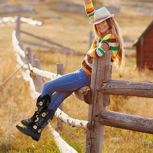 HOT ! Cowboy Boots Women Sunflower Embroidered Western Cowgirl Boots Square Toe Tall for All Season Occasions, Brown