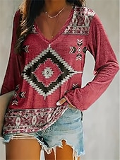 More information about Women's T Shirt V Neck Long Sleeve Tunic Vintage Ethnic Print Regular Tops Vacation Yellow Pink Navy Blue Spring Fall