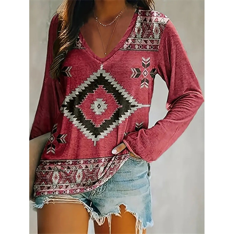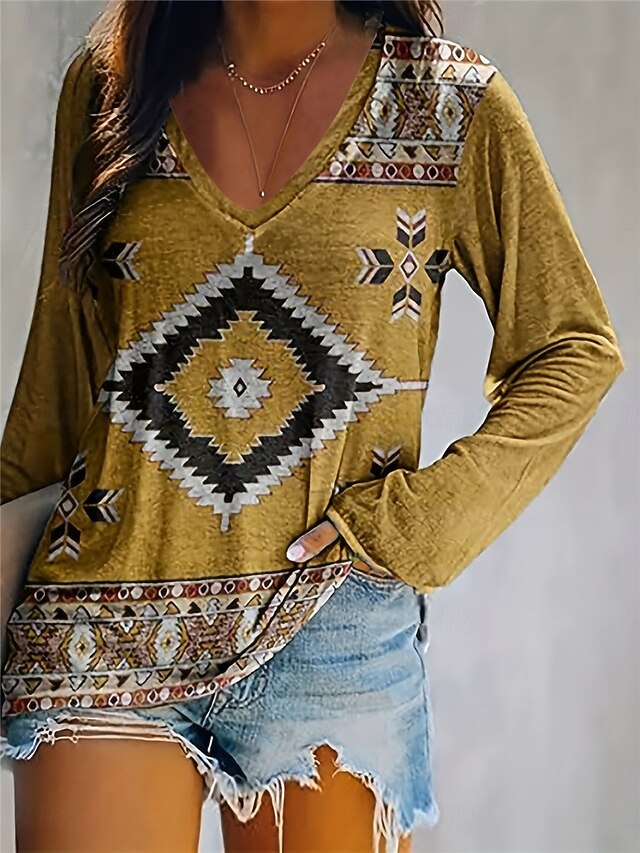 Women's T Shirt V Neck Long Sleeve Tunic Vintage Ethnic Print Regular Tops Vacation Yellow Pink Navy Blue Spring Fall 2