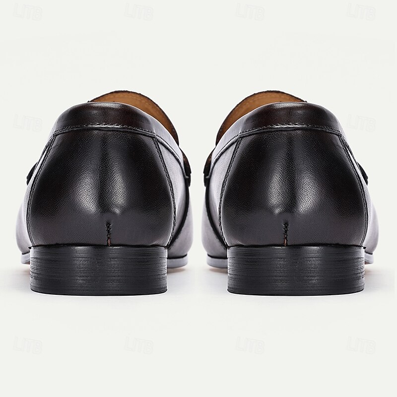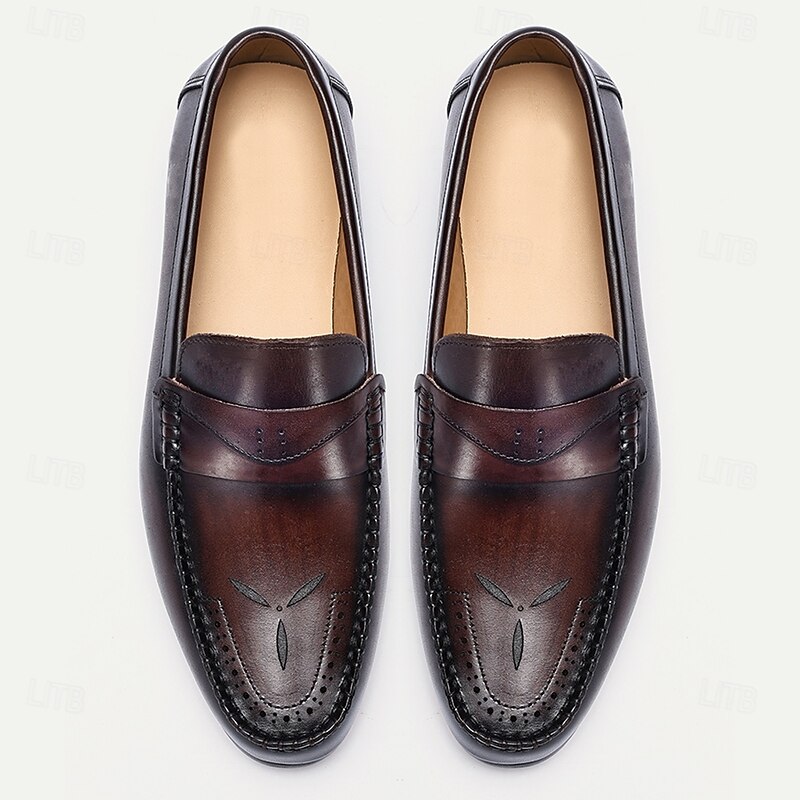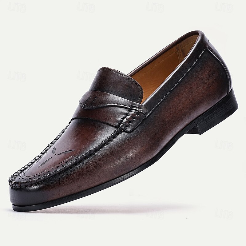 Highlights [Fabric] : Crafted from 100% genuine Italian full-grain cowhide leather, these men's loafers showcase an exquisite texture and premium durability. The rich, coffee brown hue enhances their versatility, making them suitable for a range of occasions. [Fit] : Featuring a classic penny loafer design with a round toe shape, these shoes offer a comfortable slip-on functionality. The interior is lined with soft leather material, ensuring a snug and pleasant fit throughout the day. [Design Highlights] : Intricate embossed patterns and meticulous stitching detail along the edges enhance the overall aesthetic appeal of the loafers, while also reinforcing their structure for long-term wear. The polished finish adds a touch of sophistication, making them a timeless choice. [Occasions] : Perfect for both formal and business casual settings, these loafers are ideal for office wear, meetings, and elegant outings. Their slip-resistant rubber outsole ensures stability, making them suitable for daily wear in a variety of environments. [Size Range] : Available in a comprehensive range of sizes from US6 to US13, ensuring a suitable fit for a wide array of foot sizes. These loafers are an essential addition to any well-dressed wardrobe, offering the perfect blend of style, comfort, and functionality.