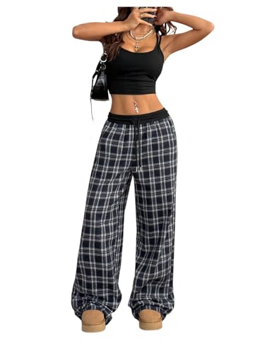HOT ! SOLY HUX Women's Plaid Checkered Pants Wide Leg Baggy Flannel Pajama Pants Cute Lounge Elastic Trousers with Pockets
