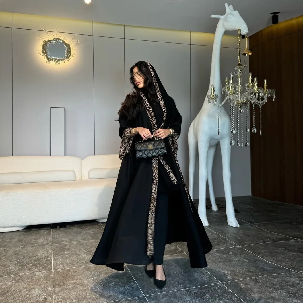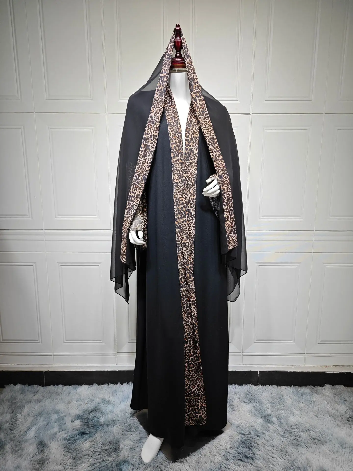 Perfect for Uni Fashion Leopard Print Maxi Abaya Dubai Patchwork Sleeve Hijab included Muslim Woman Costume 2025