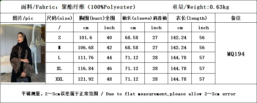 SPECIFICATIONSAge: Middle AgeBrand Name: NoEnName_NullCN: ShaanxiCare Instructions: Hand wash or professional dry cleanClosure Type: Open StitchCraft of Weaving: TatDecoration: NoneDepartment Name: AdultElasticity: Non StrechFabric Type: BroadclothFit Type: LooseHign-concerned Chemical: NoneItem Type: abayaMaterial: POLYESTERModel Number: MQ194Origin: Mainland ChinaRelease Date: Spring 2025Season: Spring/SummerSleeve Type: Long SleeveStyle: CasualSupport: Wholesale items for resaleThickness: StandardWeight: 0.63kgsize_info: {sizeInfoList:[{length:{cm:102,inch:40.16},size:S,vid:100014064},{length:{cm:107,inch:42.13},size:M,vid:361386},{length:{cm:112,inch:44.09},size:L,vid:361385},{length:{cm:117,inch:46.06},size:XL,vid:100014065},{length:{cm:122,inch:48.03},size:XXL,vid:4182}]}whether full opening: YesMQ194 Uni Fashion Leopard Print Maxi Abaya Dubai Patchwork Sleeve Hijab included Muslim Woman Costume 2025Model No: MQ194Fabric Type: PolyesterSize: S/M/L/XL/XXLColor: Black AbayaStyle.: Muslim Fashion Islamic ClothingAttention:  The sizes vary from different styles,please order as per our size chart.Note:1. Pure manual measurement,there may be 2-3CM error is normal2.All size took by real items. Please check size chart seriously before you place the order.3.All of the size uint is centimeter(cm), please comfirm before you place order.4.Color difference problem :There will be only little color difference due to different monitors and light,please understand this, thank you so much. please contact us if any questions, please contact us .5.If you are not sure about the size ,please tell me your height weight and bust , that can help you make a good choice on the size ,I will give you the best advice.  We strive from perfection in every details of our clothes. All products are manufactured in our own factory,using sublimation toobtain the most vivid colors and the highest lever of durability. From printing, cutting, sewing, ironing packaging to finishedproducts, we will do QC twice. Every Product in mass production is as perfect as your approved sample.Xi'an Uni Trading Co.,Ltd. is a professional manufacturer and exporter of muslim dress. Our company is one of leading manufacturers of islamic clothing in China.We have experienced design team and professional production team. Designer team constantly renews the products with fashion trend and providing high-quality custom service Production Team are always looking for comfortable and natural fabrics for a variety of desian options in shortest time.