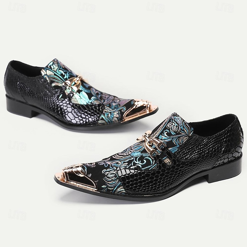 Highlights [Fabric] : Crafted from premium Italian full-grain cowhide leather, these men's loafers offer a luxurious and durable experience. The inclusion of a stylish embossed color block pattern enhances the texture, delivering an opulent appeal suitable for fashion-conscious individuals. [Fit] : These loafers feature a slip-on design with a comfortable and ergonomic structure, making them easy to wear and ideal for all-day use. The low-profile heel ensures a seamless blend of elegance and practicality, perfect for both formal and semi-casual settings. [Design Highlights] : The loafers boast a striking floral embroidery combined with a polished metallic pointy toe cap that adds a bold yet sophisticated element to the overall design. The metal buckle detail further elevates the style, merging contemporary fashion with classic sophistication. [Occasions] : Versatile in their appeal, these loafers are perfect for formal events such as weddings, corporate meetings, and elegant dinners. Their stylish design also makes them suitable for smart-casual gatherings, offering a fashionable statement for any occasion. [Size Range] : Available in a wide size range, from US6 (EU39, UK5) to US13 (EU46, UK12), these loafers cater to diverse foot sizes, ensuring a comfortable fit for every wearer.