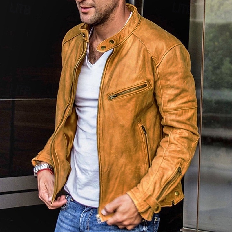 More information about Men's Faux Leather Jacket Transition Jacket Biker Jacket Vintage Leather Jacket Vacation Daily Windproof Warm Pocket Fall & Winter Plain Fashion Classic Stand Collar Regular Faux Leather Black Yellow