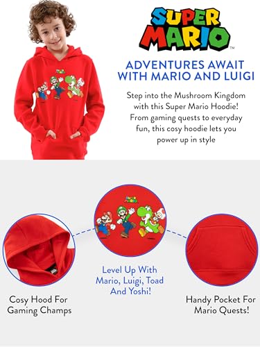 • Super Mario Spotlight: Dive into a dazzling red with this Mario hoodie for boys. Featuring everyone's favorite characters – Mario, Luigi, Toad, and Yoshi – it's the ultimate Super Mario clothing piece for any gaming enthusiast