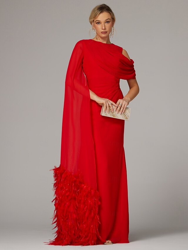 Sheath Evening Gown Elegant Dress Formal Fall Sweep / Brush Train Sleeveless Floor Length Cowl Neck Chiffon with Feather Ruched Slit