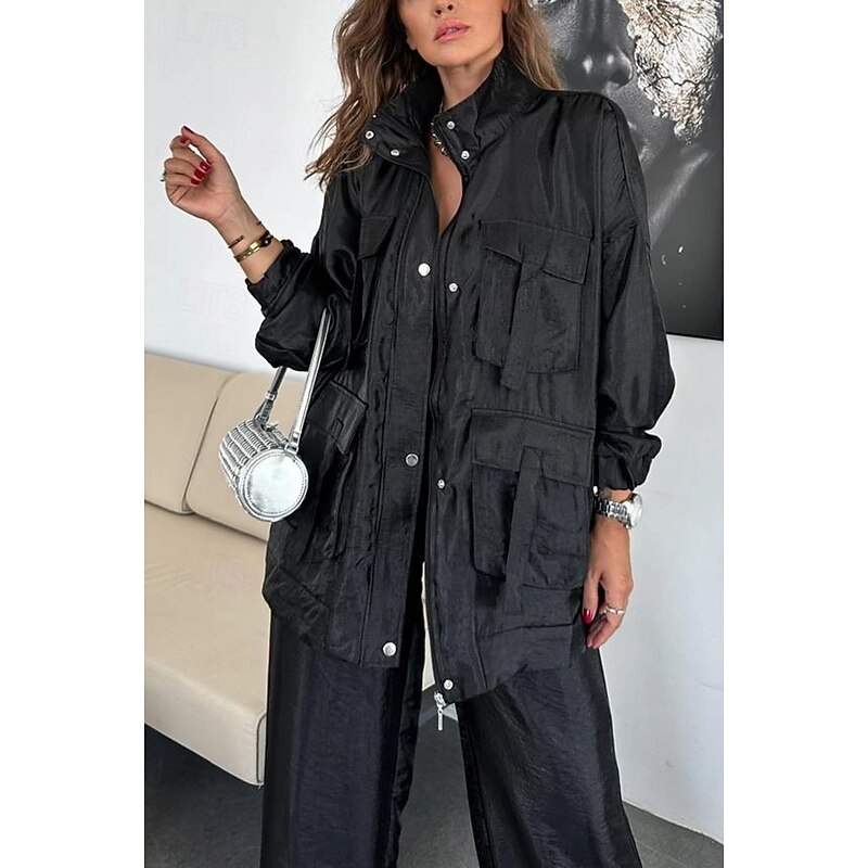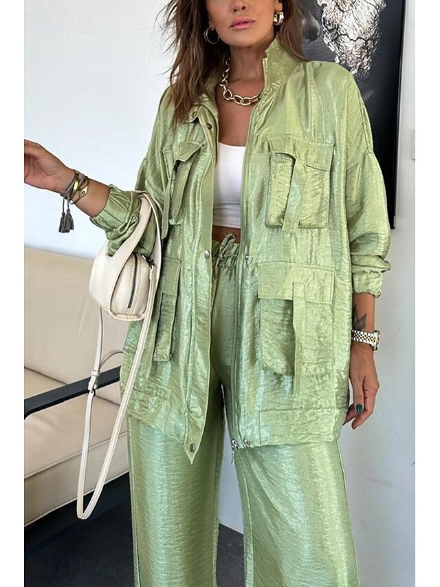 Women's Suits Comfortable Drawstring Pocket Full Zip Sports Fashion Daily Retro Plain School Vacation Home Office Cardigan Regular Stand Collar Loose Fit Long Sleeve Outerwear Silver Lake blue Black 1