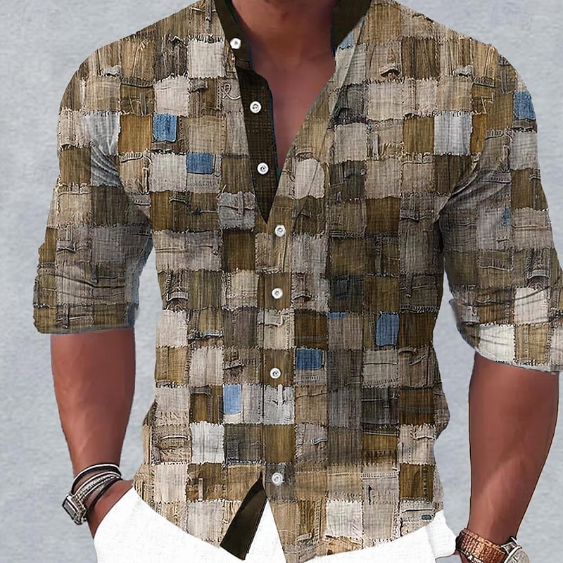 : With a sophisticated standing collar and button-down front, this shirt features an eye-catching geometric plaid pattern in hues of blue, pink, purple, and plum. The distinctive patchwork design and the contrast inner collar and button placket add an element of modern style and refinement.
