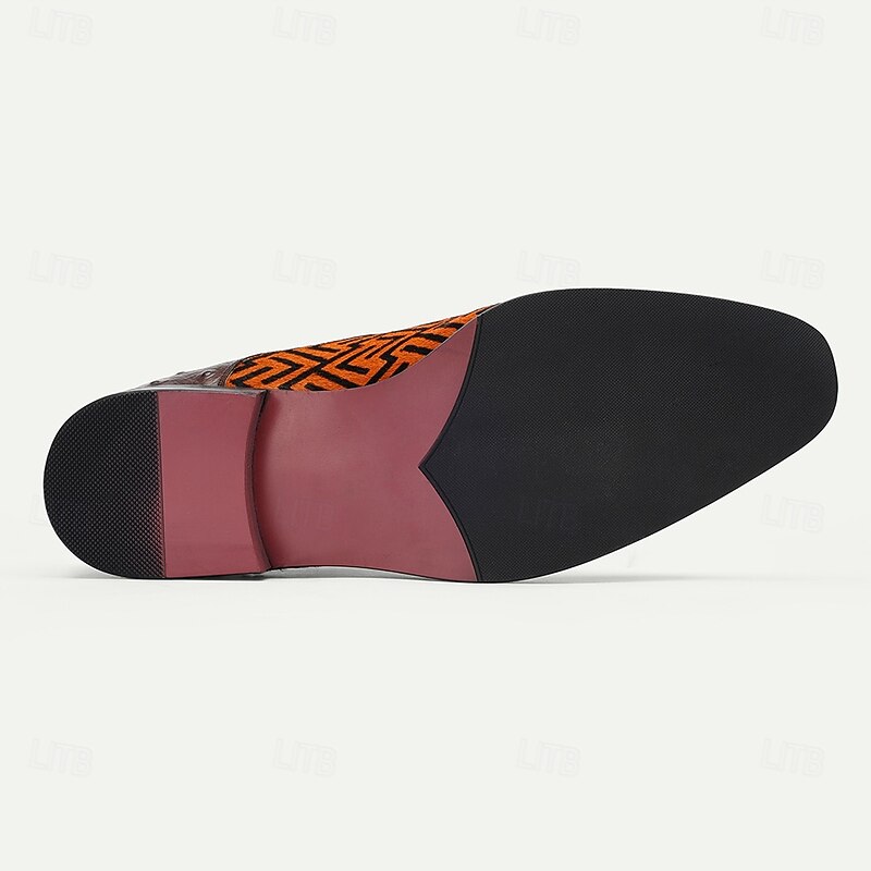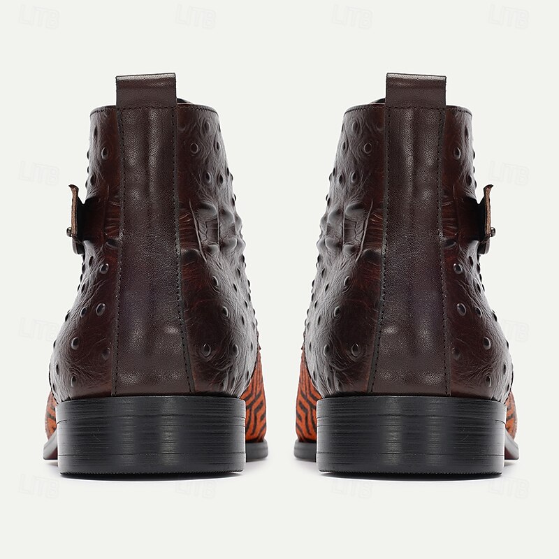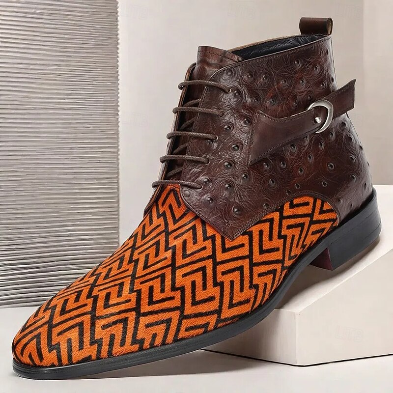 Highlights [Fabric] : Crafted from a luxurious blend of premium cowhide leather and pony hair, these men's ankle boots showcase a rich texture and durability. The high-quality leather provides a sophisticated look, while the pony hair detailing offers a unique touch to the design. [Fit] : Designed with comfort and style in mind, the boots feature a classic round toe shape and sturdy rubber outsole. The lace-up closure along with metal buckle detail ensures a secure and adjustable fit. [Design Highlights] : These boots boast a striking orange and black geometric pattern, creating a bold contrast that is both fashionable and unique. The metal buckle adds an element of sophistication, making them suitable for various occasions. [Occasions] : Perfect for both casual and formal settings, these boots can seamlessly transition from a day at the office to an evening out. Ideal for fall and winter, they add a touch of flair to any outfit and make an impressive style statement. [Size Range] : Available in a wide range of sizes from US6/EU39/UK5 to US13/EU46/UK12, ensuring a perfect fit for different foot sizes and providing versatility in style options.