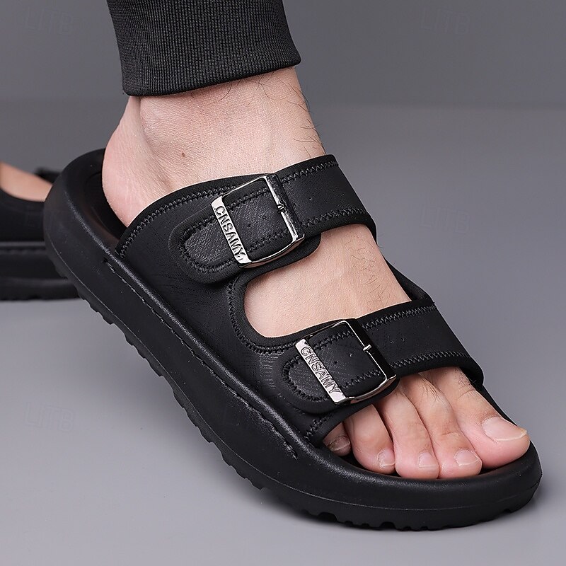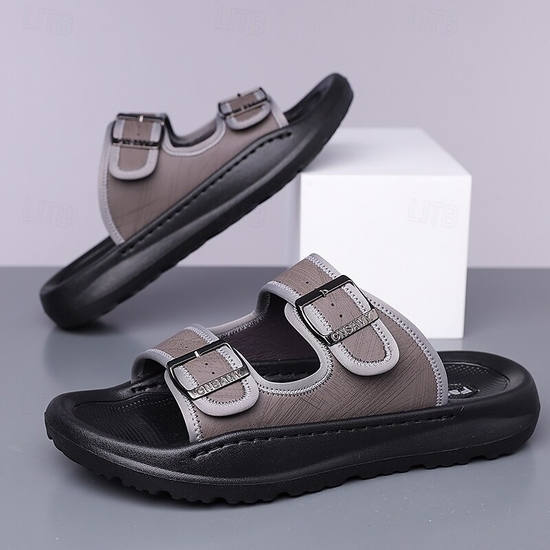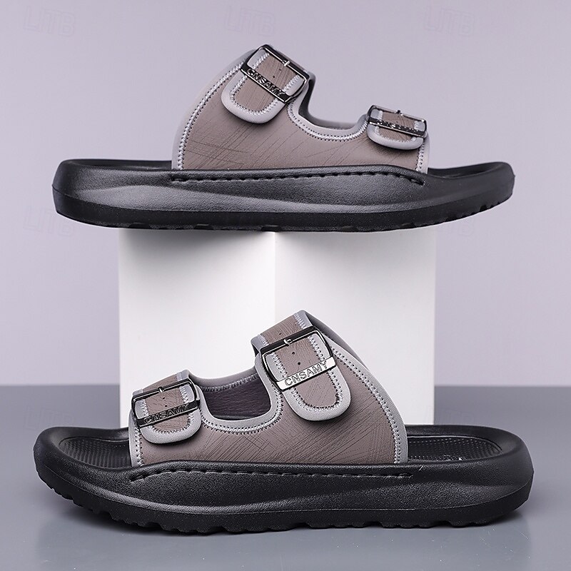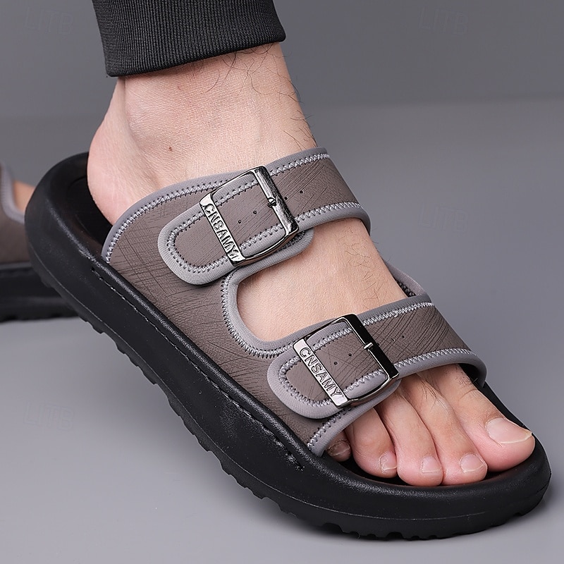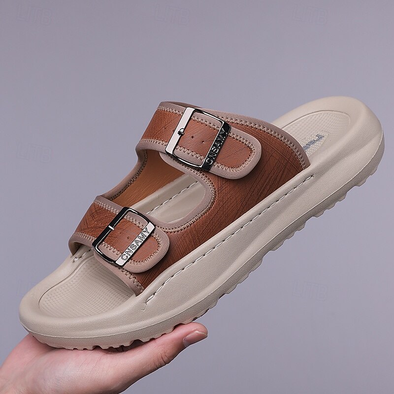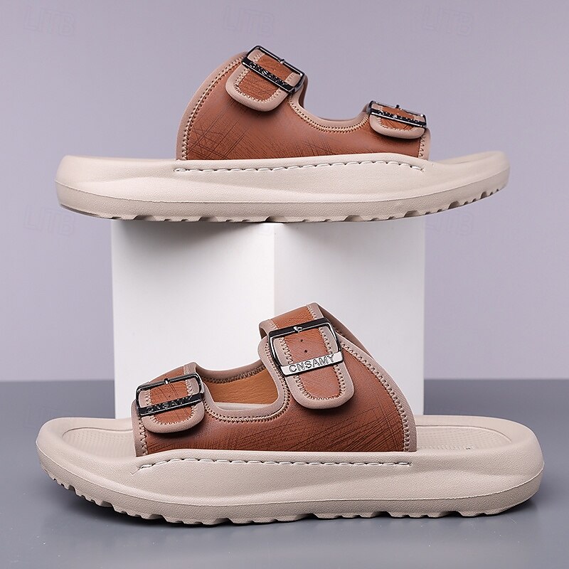 HOT ! Men's Brown Two-Buckle Faux Leather Sandals with Comfortable Footbed and Durable Sole – Adjustable Slip-On Summer Shoes for Casual and Outdoor Wear