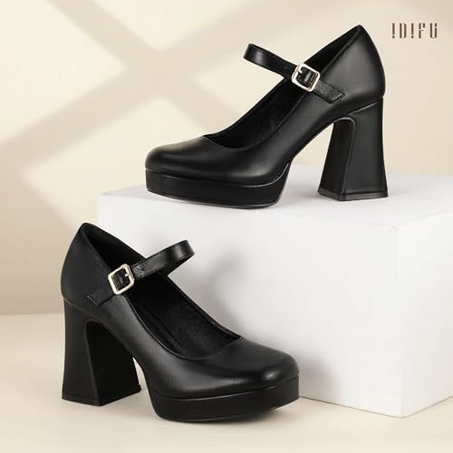 IDIFU IN4 Platform Mary Jane Shoes Women's Pumps High Chunky Square Closed Toe Heels Block Ankle Strap Work Wedding Prom Comfortable Dress Shoe Dressy Cute Trendy Vintage Heel Pump Shoes 4
