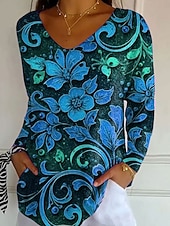 More information about Women's T Shirt V Neck Long Sleeve Tunic Floral Graphic Plants Vintage Stylish Classic Regular Tops Daily Print Blue Purple Orange Spring Fall