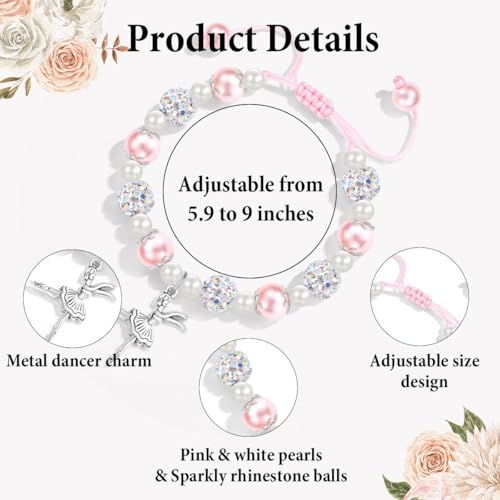 • Size & Material: This Ballerina Bracelet is adjustable from 5.9 to 9 inches with a sliding knot. Comebined with pink & white pearls, sparkly rhinestone balls, and a metal dancer charm, it is cute and shiny for girls.