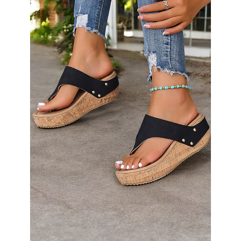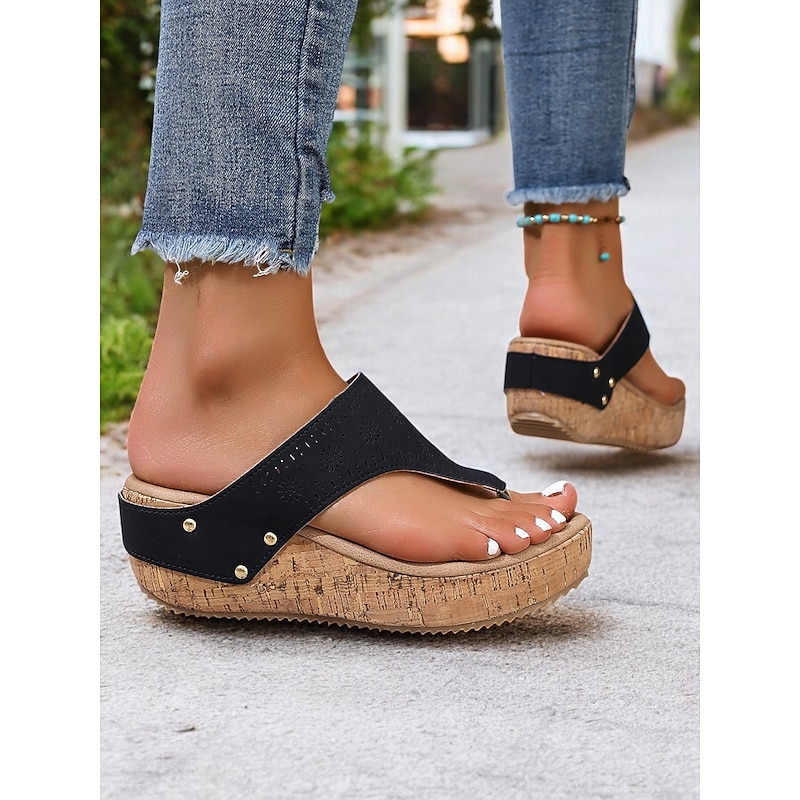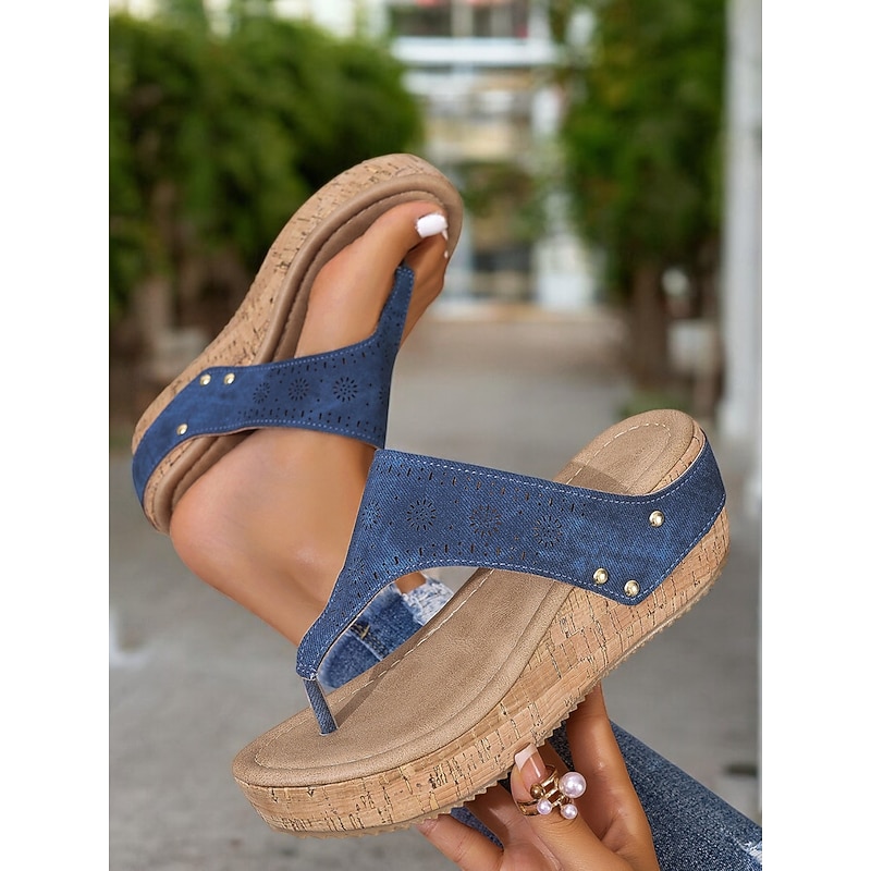 HOT ! Women's Blue Cork Wedge Sandals with Laser-Cut Design, Open Toe Slip-On Summer Shoes for Casual Outings and Beach Vacations