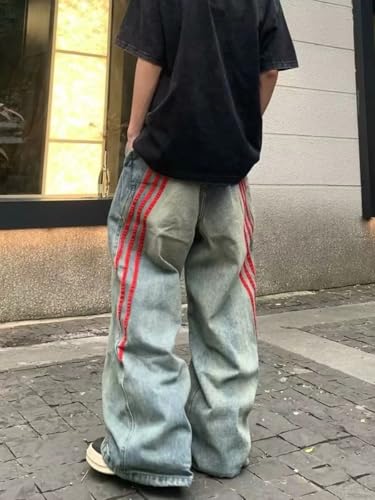 HOT ! Vintage Grunge Red Striped Wide Leg High Waist Jeans Patchwork Harajuku Hip Hop Casual Trendy Y2k Baggy Pants