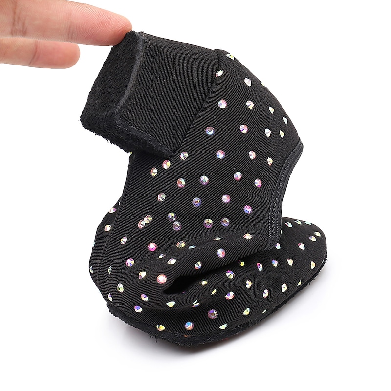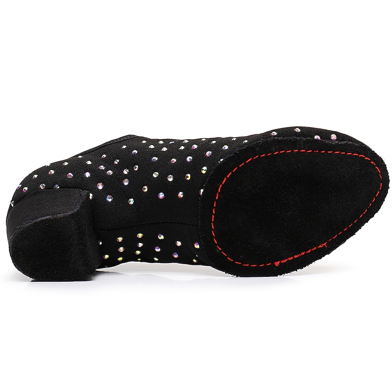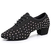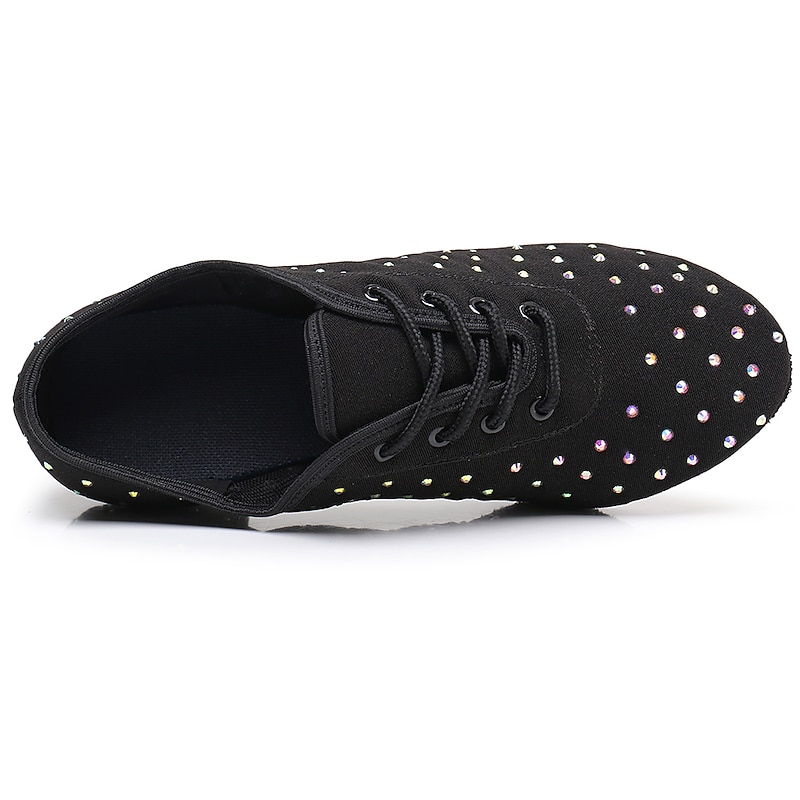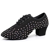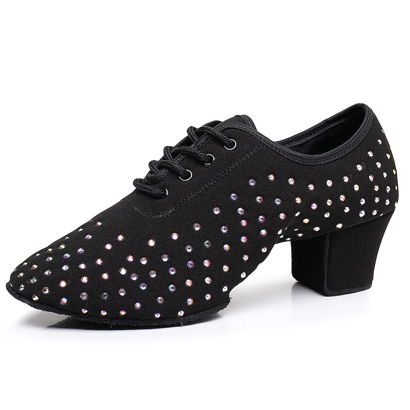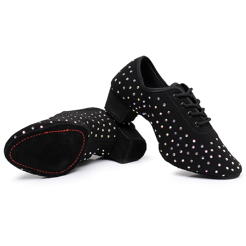Highlights [Fabric and Material] : Crafted with exquisite sparkling glitter and high-quality Oxford fabric, these women's ballroom dance shoes feature a luxurious black finish. Accented with eye-catching rhinestones, they offer a glamorous touch that captures the light beautifully during your dance routines. [Fit and Style] : Designed with a comfortable low to mid heel, ranging from 1.38 inches (3.5 cm) to 2 inches (5 cm), these shoes provide stability and ease of movement, making them ideal for both intensive practice sessions and elegant performances. The lace-up closure ensures a secure fit, while the rounded toe shape accommodates comfortable prolonged wear. [Design Highlights] : The shoes feature a sophisticated lace-up design, which not only adds to the aesthetic appeal but also provides a customizable, snug fit. The delicate rhinestone embellishments create a dazzling effect, perfect for catching attention on the dance floor. [Occasions] : These versatile dance shoes are perfect for a variety of occasions, including professional performances, practice sessions, and any event where you want to showcase your dance skills in style. They are ideal for modern dance genres like ballroom, Latin, and salsa. [Size Range] : Available in an extensive range of sizes from 34 to 45, these shoes cater to a variety of dancers, ensuring you find the perfect fit for your dance needs.