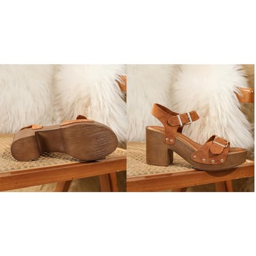 Womens Suede Platform Chunky Heel Retro Sandals with Adjustable Buckle Fashion One Word Belt Platform Block Heels Open Toe Wedding Party Dress Studded Sandals 5