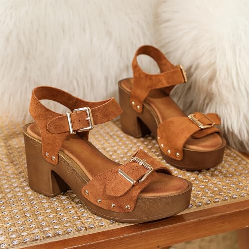HOT ! Womens Suede Platform Chunky Heel Retro Sandals with Adjustable Buckle Fashion One Word Belt Platform Block Heels Open Toe Wedding Party Dress Studded Sandals