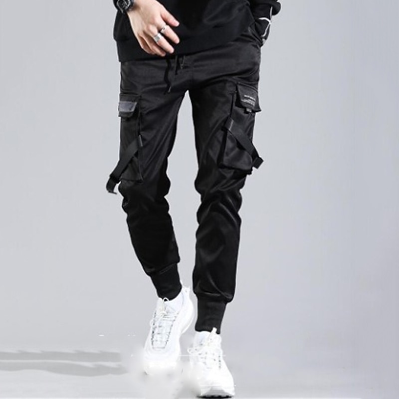 Highlights [Fabric]: Crafted from high-quality polyester, these men's cargo joggers offer a superb combination of durability, comfort, and breathe-easy wear. The lightweight fabric is ideal for active days, providing comfort throughout the wear. [Fit]: Featuring a regular fit, these joggers have a flattering tapered silhouette that ends with elastic cuffs, adding a modern sporty edge while ensuring a comfortable fit without restriction. [Design Highlights]: The pants are an epitome of techwear with multi-pocket functionality – including large side flap pockets and smaller zippered ones for enhanced utility. The added design of drawstring and elastic waist ensures personalized adjustability. Additional straps and buckles contribute to a rugged, urban aesthetic, perfect for city adventurers. [Occasions]: Versatile in style, these joggers are perfect for a range of activities including casual outings, daily wear, sports occasions, and holiday adventures. Their fashionable yet relaxed design makes them easy to pair with sneakers for a contemporary look. [Size]: Available in a wide range of sizes from S to 3XL, catering to diverse body types and preferences, ensuring the perfect fit for anyone seeking comfort and style in their daily wardrobe.