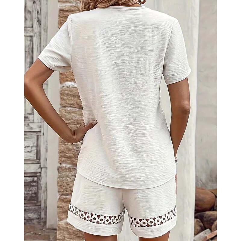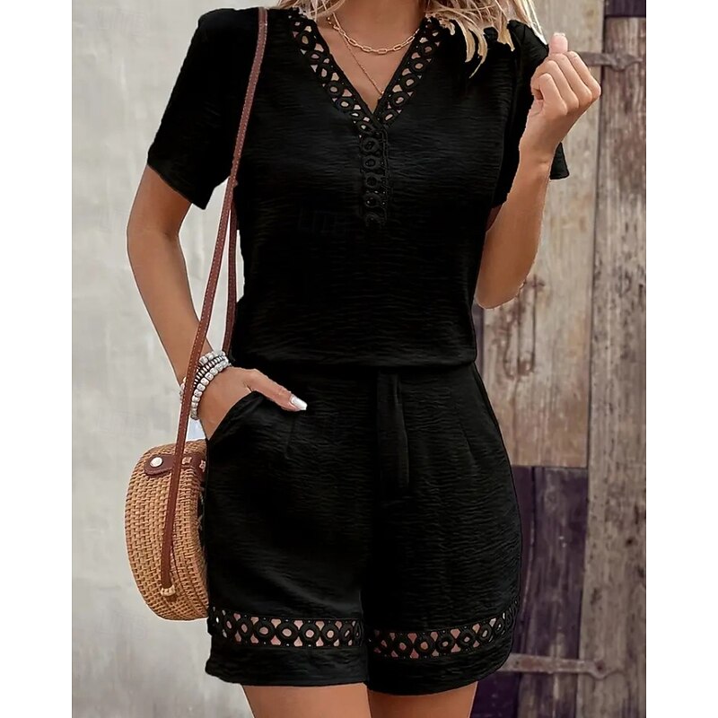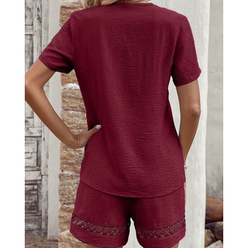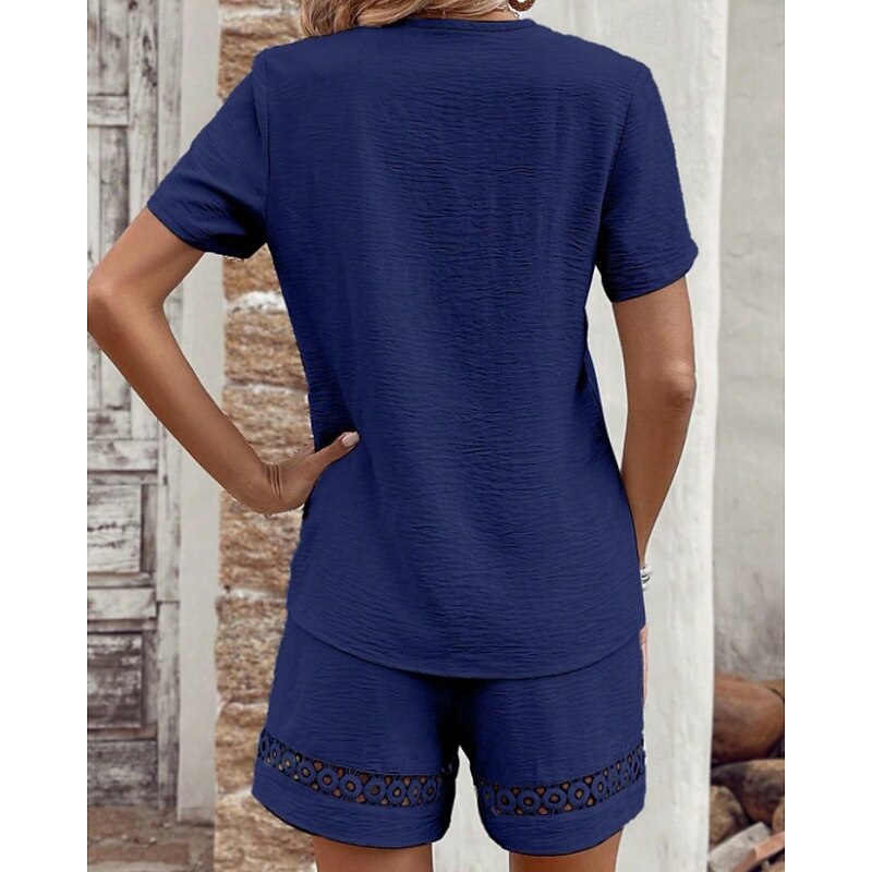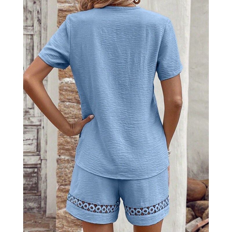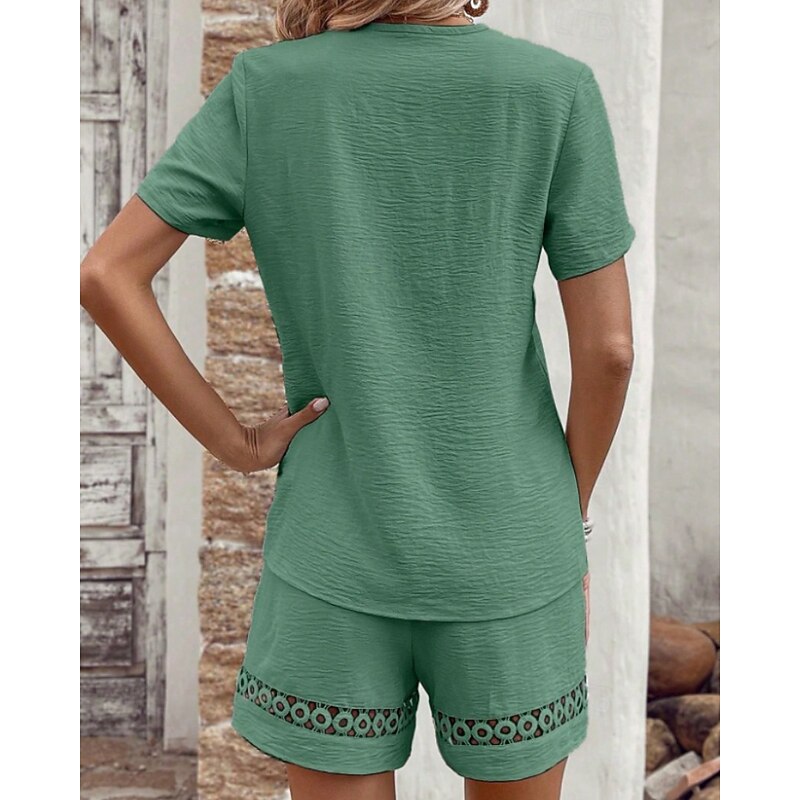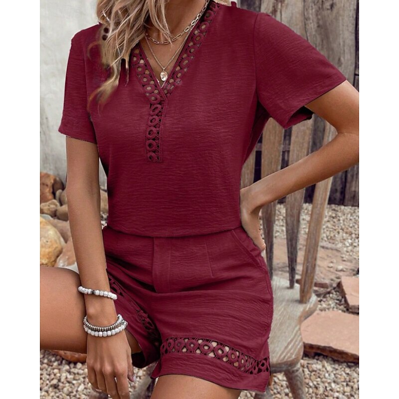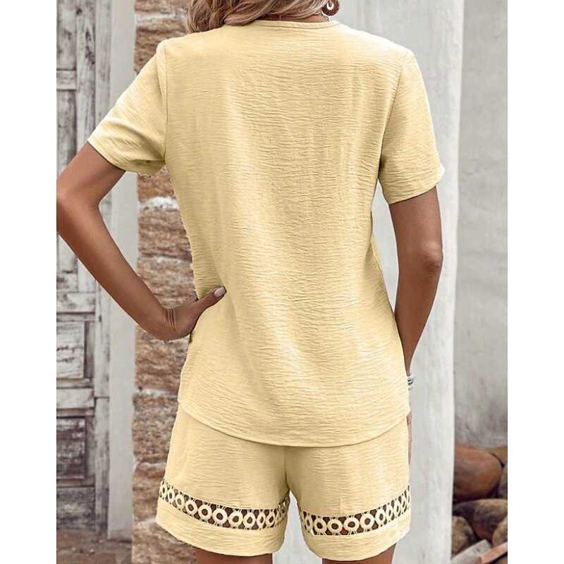 More information about Women's Active Cotton Linen Sets Blouse Shorts Sets Short Sleeve V Neck Solid Color Hole Daily Holiday Black Yellow Pink Summer Regular Fit