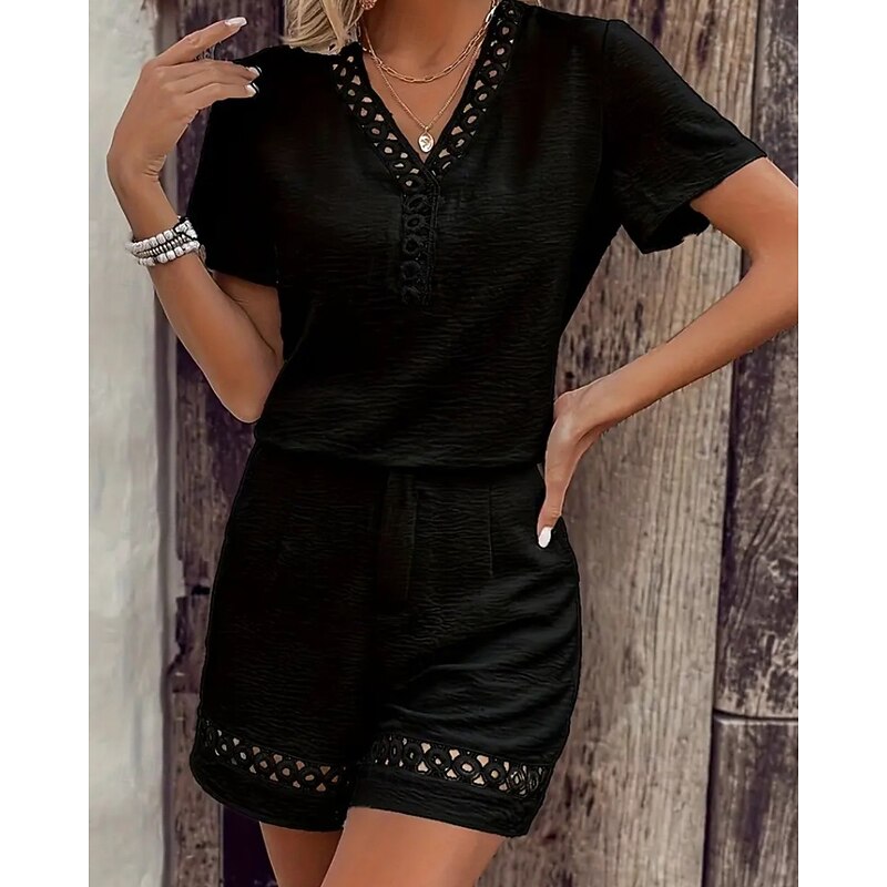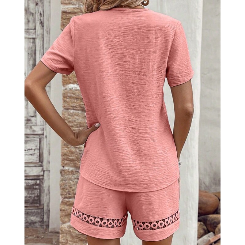 HOT ! Women's Active Cotton Linen Sets Blouse Shorts Sets Short Sleeve V Neck Solid Color Hole Daily Holiday Black Yellow Pink Summer Regular Fit
