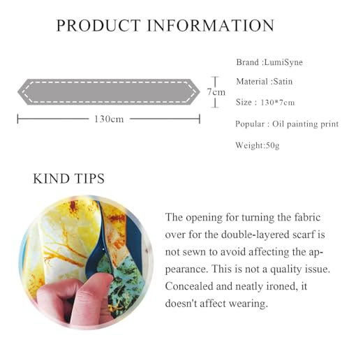 • SELECTED FABRIC: The scarf is made of high quality satin fabric, delicate and soft to the touch. The satin surface is smooth and naturally emits a soft luster. Double-layered fabric to add stereoscopic texture. Lightweight and draping for a flowing effect. Premium fabric with good moisture absorption and color rendering. Both colorful and breathable dry, our silk scarf brings you a truly beautiful and cosy wearing experience. Inside sewing edge design, fine workmanship, neat and beautiful trim.