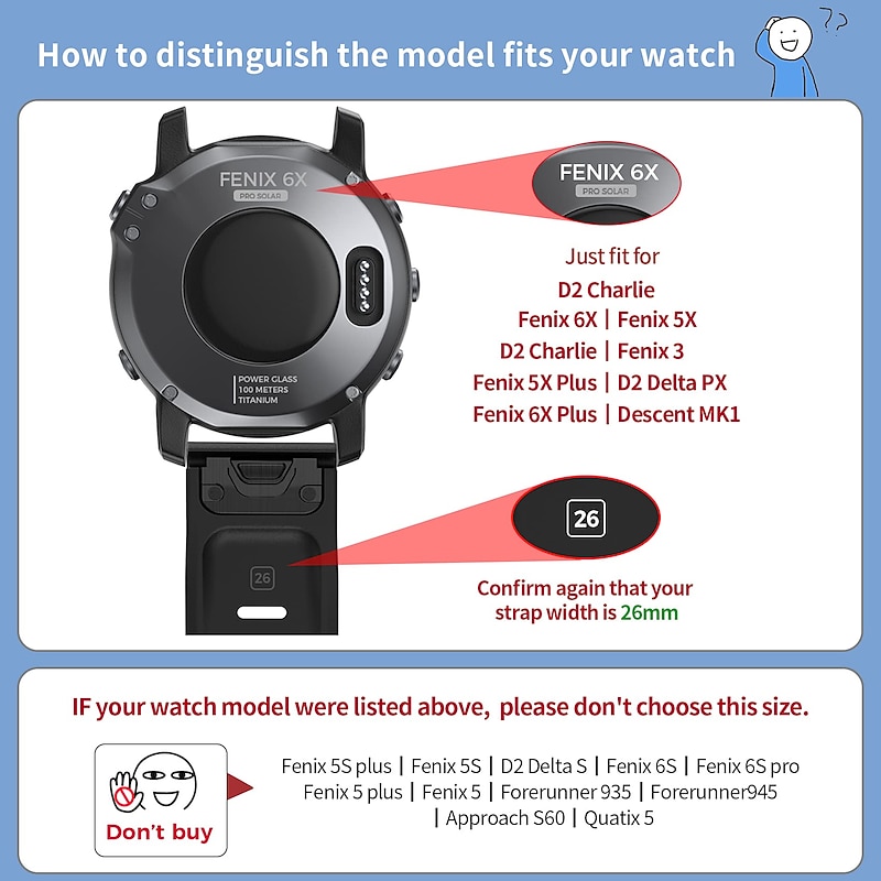 1. Compatible with a wide range of models: The fenix 6x band is designed to perfectly fit Fenix 6X, fenix 6X pro, fenix 5X, fenix 5X plus, Fenix 3, Fenix 3hr, Descent MK1, D2 Delta PX, D2 Charlie Smartwatches. To ensure compatibility, please check your watch model and the list of compatible models we provided.