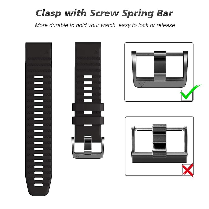 2. Durable stainless steel clasp: Our fenix 6x watch band features a strong screw bar clasp that securely holds the band in place. The use of a screw bar clasp with silicone connection makes it more durable, especially for outdoor sports activities.