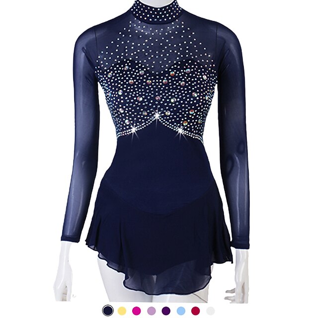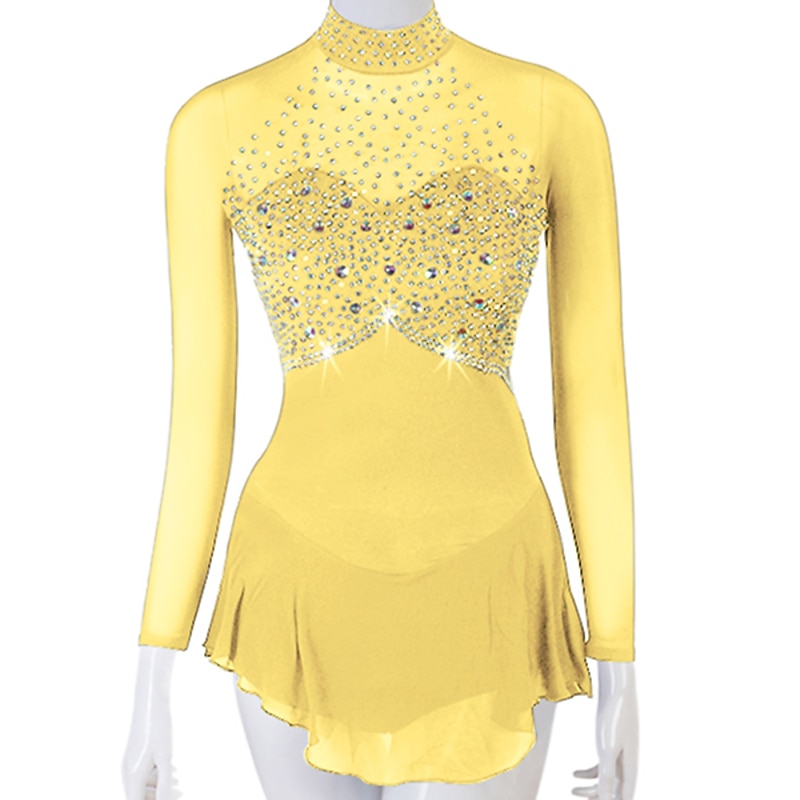 Figure Skating Dress Women's Girls' Ice Skating Dress Outfits Yellow Dark Red Dark Navy Patchwork Mesh Spandex High Elasticity Practice Professional Competition Skating Wear Crystal / Rhinestone 12