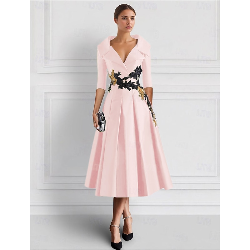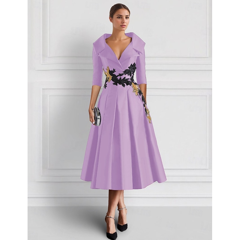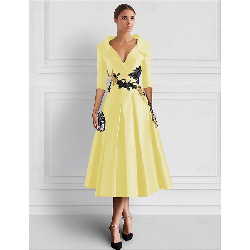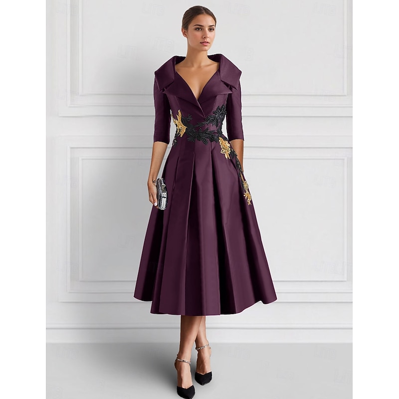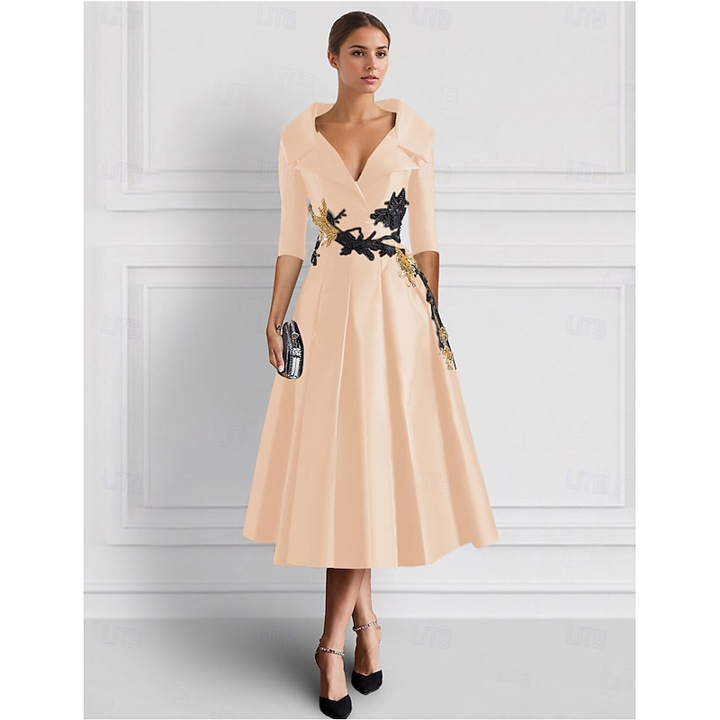 More information about Embroidered A-Line Cocktail Dresses Tuxedo Dress Mother of Bride Elegant Formal Ankle Length 3/4 Length Sleeve Shirt Collar Pocket Satin with Appliques