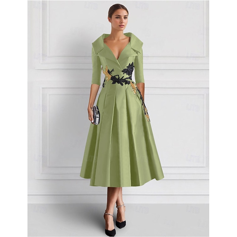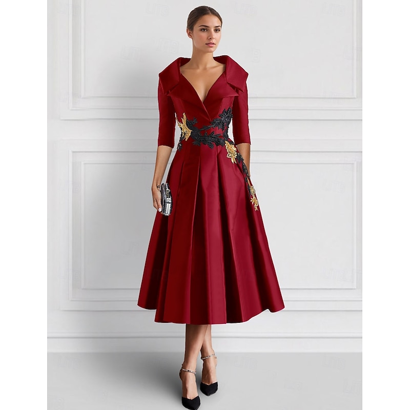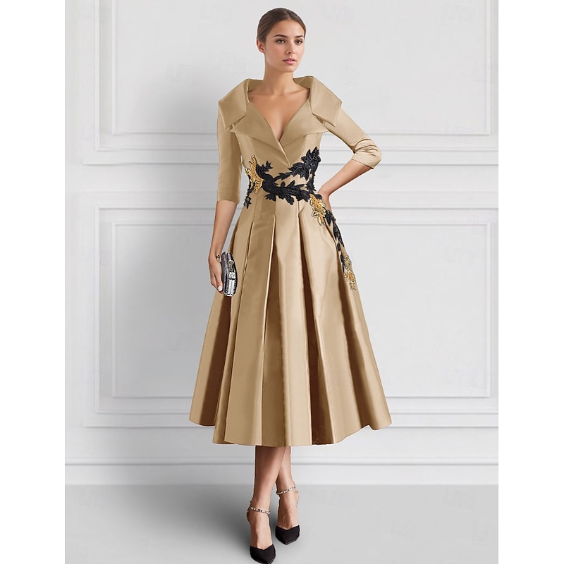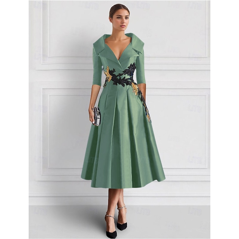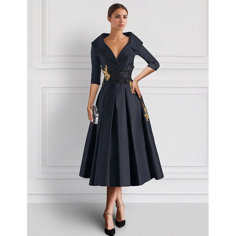 More information about Embroidered A-Line Cocktail Dresses Tuxedo Dress Mother of Bride Elegant Formal Ankle Length 3/4 Length Sleeve Shirt Collar Pocket Satin with Appliques