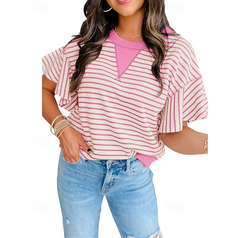 HOT ! Women's T Shirt Striped Fashion Modern Short Sleeve Crew Neck Regular Tops Daily Patchwork Pink Brown Green Summer
