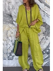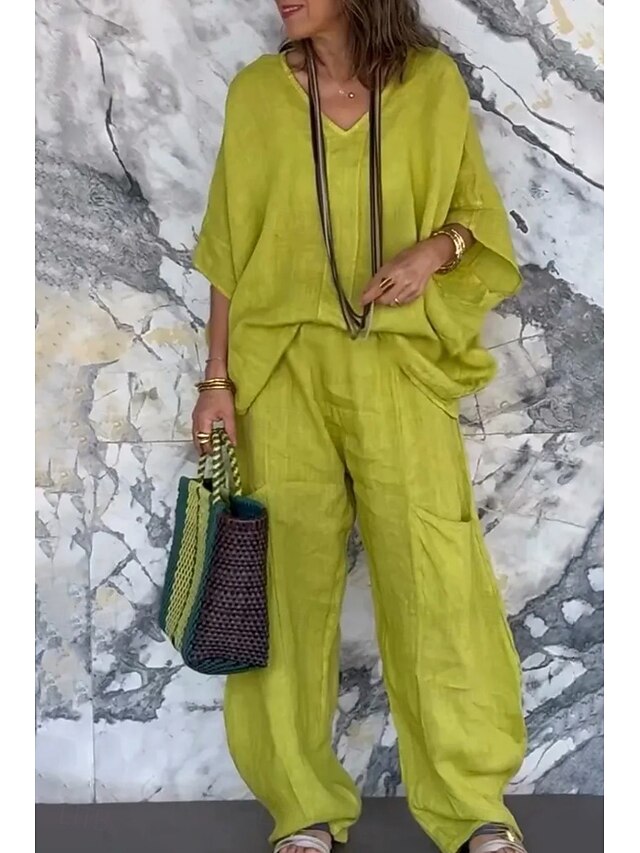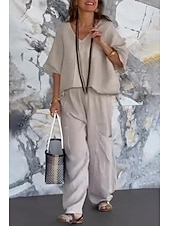 More information about Women's Daily Shirt Cotton Linen Sets Two Piece Sets Half Sleeve V Neck Solid Color Daily Wear Casual Daily Black Light Green Light Grey Summer Regular Fit