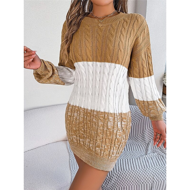 Highlights [Fabric] : Crafted from soft, cozy acrylic, this women's sweater dress offers micro-elasticity and comfort, making it perfect for fall and winter months. The ribbed knit style ensures a snug fit while maintaining the dress's shape after every wear. [Fit] : Featuring a regular fit, the dress is designed to lightly hug the body's natural curves without being too tight. The long design provides ample coverage, adding to the cozy appeal, while the crew neck and long sleeves contribute to a balanced silhouette. [Design Highlights] : The dress showcases a sophisticated color-block pattern in earthy tones such as black, wine, and khaki. The cable-knit pattern adds texture and interest, while ribbed cuffs and hemline offer a neat and polished finish. [Occasions] : This versatile sweater dress is perfect for daily wear, outdoor adventures, and weekend activities. Whether you're planning a casual day out or a more refined occasion, its effortless elegance makes it a go-to choice for cooler seasons. [Size Range] : Available in sizes S, M, and L, this sweater dress accommodates a range of body types, ensuring a comfortable and flattering fit for various figures.