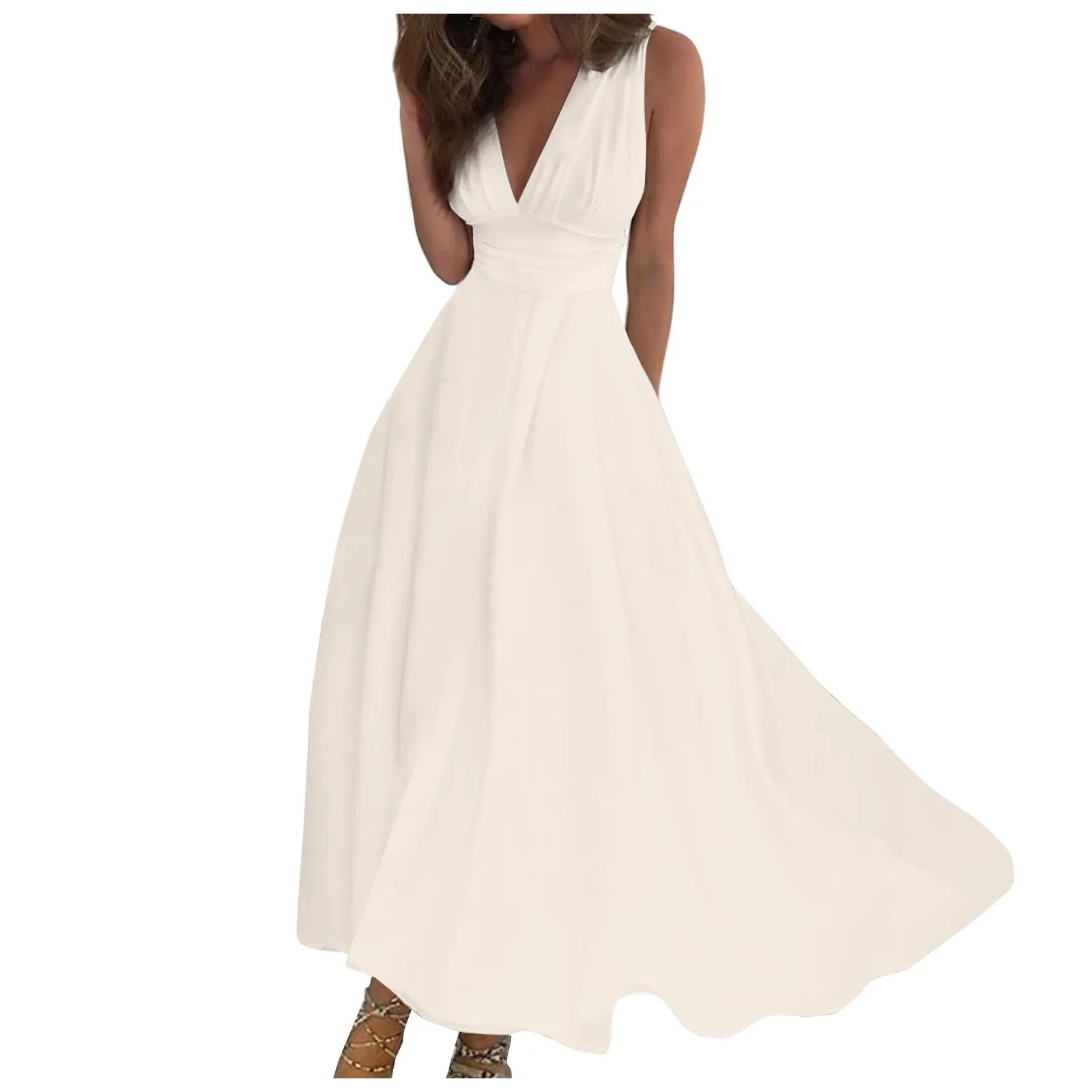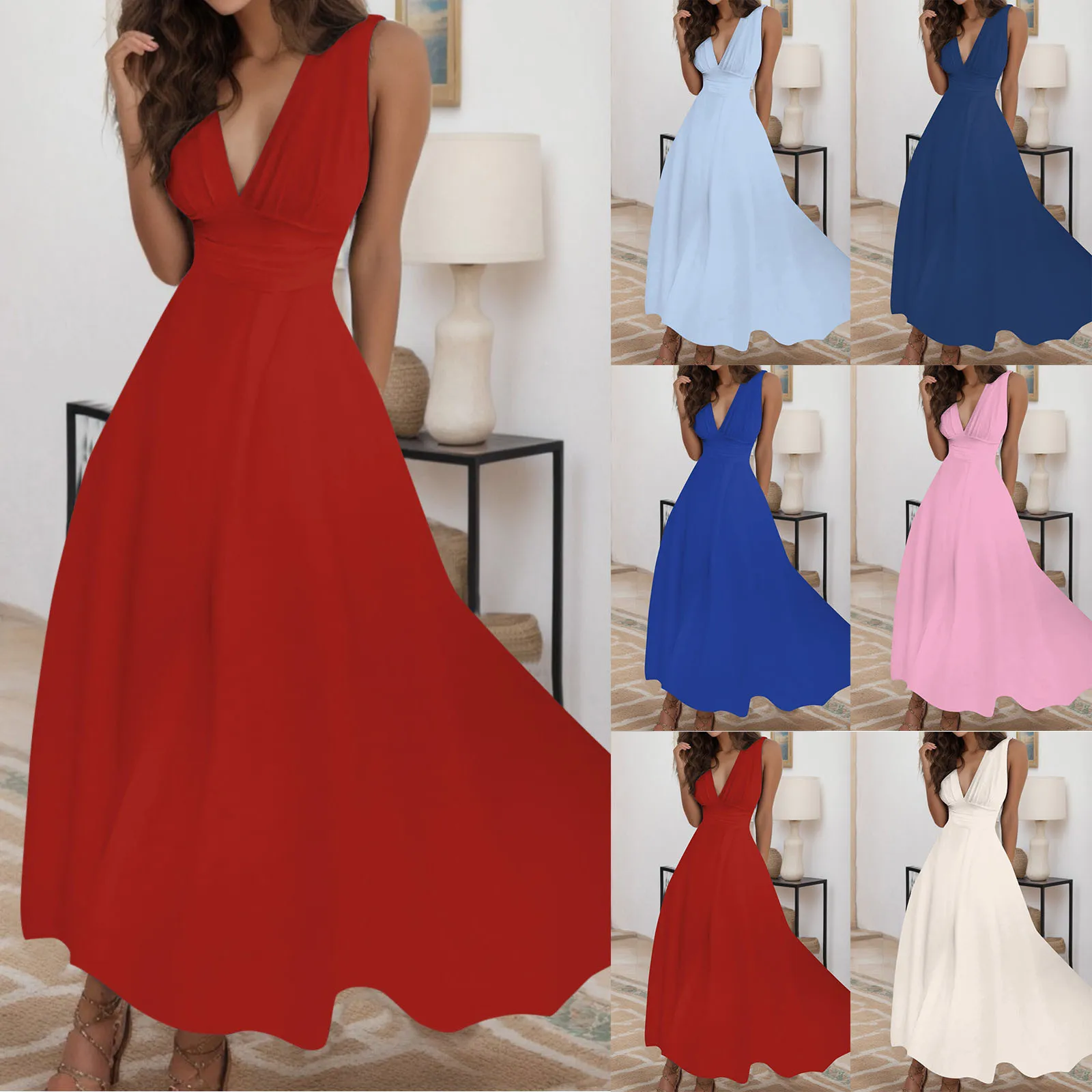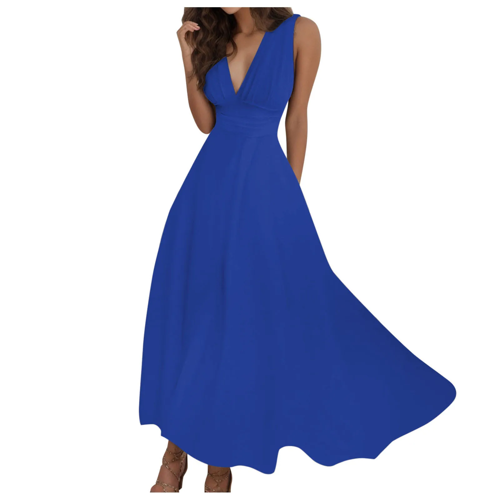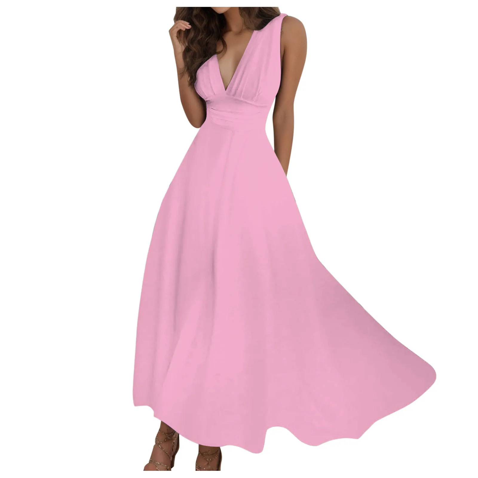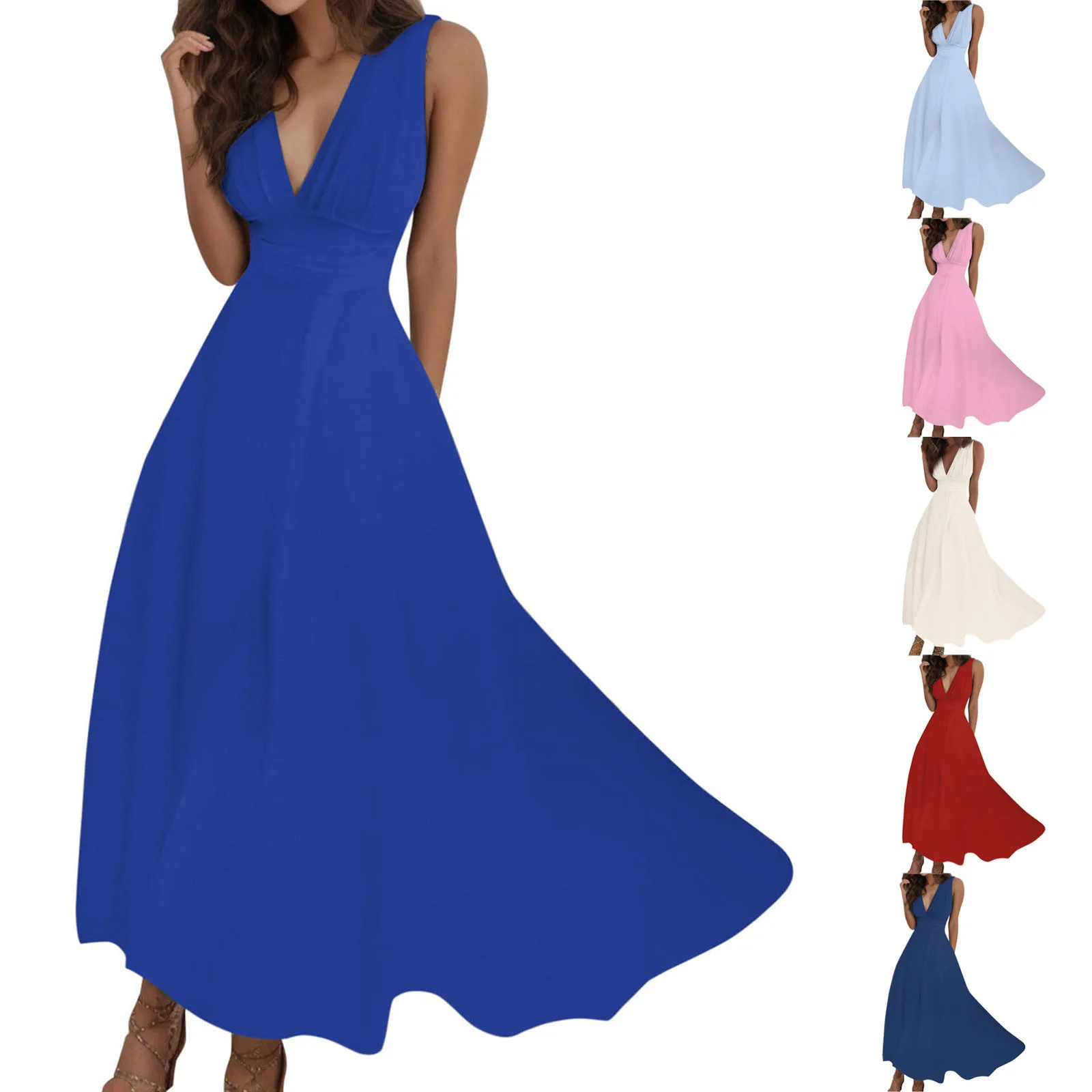Women Sexy Deep V Neck Formal Dresses A Line Solid Color Sleeveless Long Dresses For Women Casual Tunic Dress Summer Tank Dress