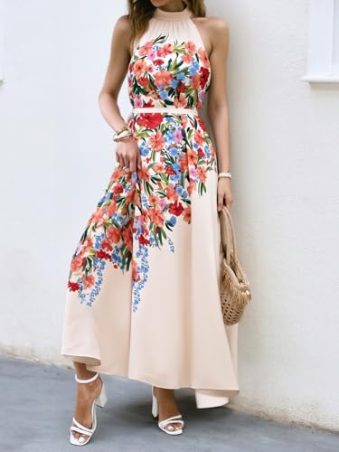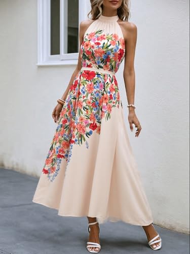 Women’s Floral Maxi Dress Casual A-Line Halter Neck Sleeveless Flowy Vacation Wedding Guest Long Dresses with Belt 2025 2