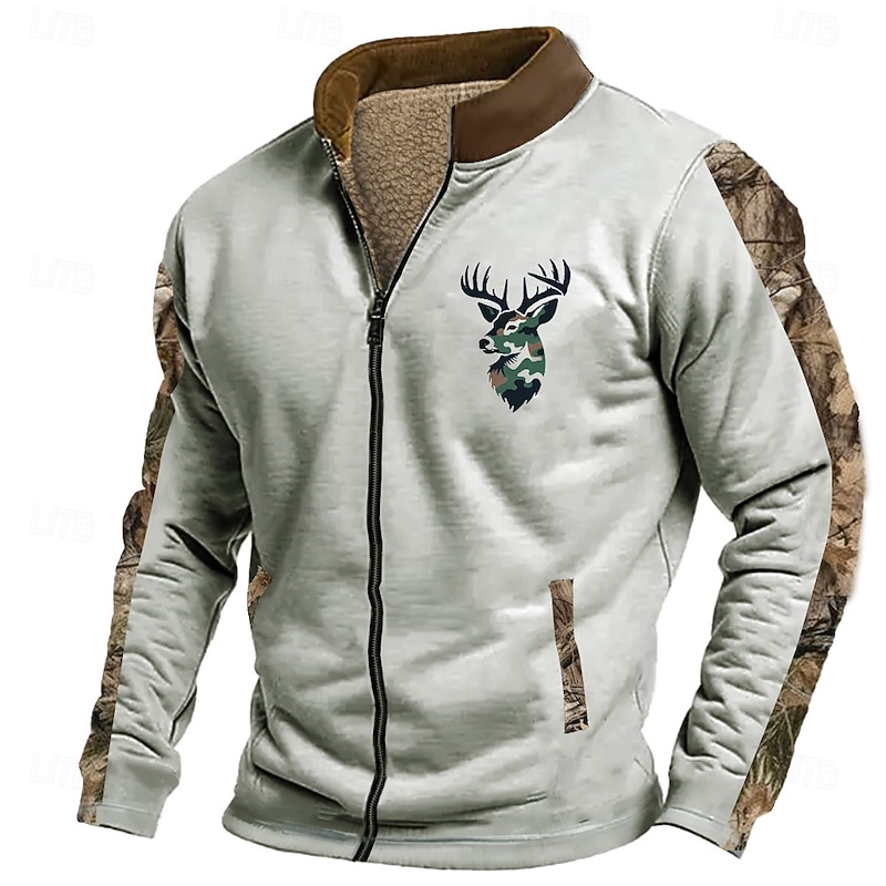 Men's Deer Sweatshirt Sweatshirt Zip Sweatshirt Long Sleeve Sweatshirt Stand Collar Zip Fashion Daily Simple Print Vacation Holiday Going out Pocket Front Zipper Winter 1