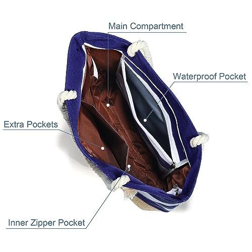 • 【ZIPPER AND INNER LINING : The lightweight and foldable cotton beach tote bag is easy to clean and carry. It features a top zipper closure & inner lining design. Perfect for travel, beach, vacation, swim pool bag, work bag, weekend bag, cruise must haves, everyday bag, etc