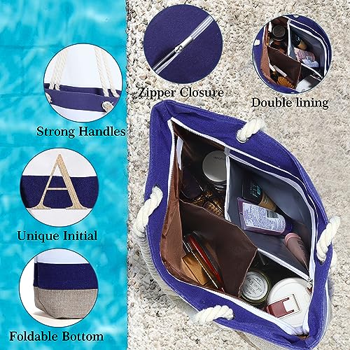 YOOLIFE Initial Canvas Waterproof Beach Tote Bag Zipper Personalized Gifts for Women Her Birthday Travel Beach Essential 4