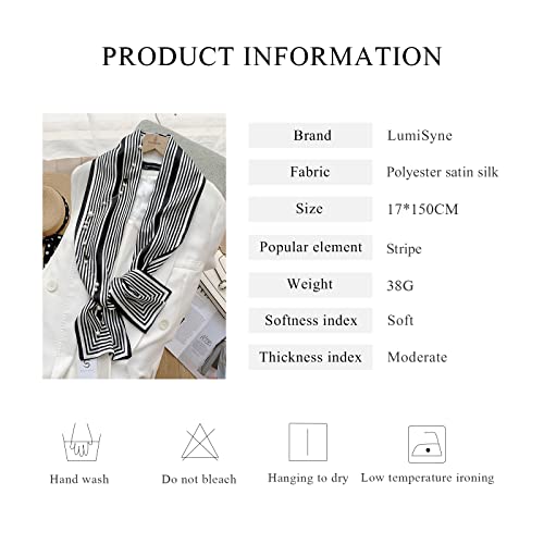 • MULTIPLE WEARING WAYS: The skinny scarf measures 17x150 cm, allowing you to play with individual wearing ways. Use as a neckerchief to enhance your style and the vertical stripes visually flatter your neckline. As a hair ribbon, the casual languor emanates inadvertently is the most charming. Use as a headband for a strong vintage appeal. Use as a belt to emphasize the waistline and shape body proportions. Wrap around the handle for a creative twist that adds color and interest to the handbag.