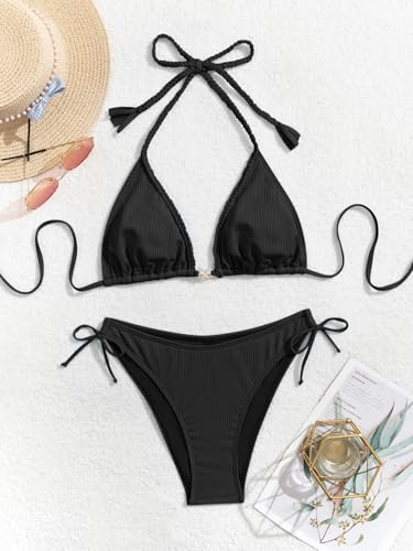 Eomenie Ribbed Bikini Sets for Women Sexy Halter Triangle Top Two Piece Bathing Suit Tie Side Swimsuit 5