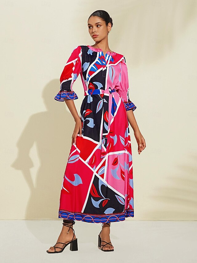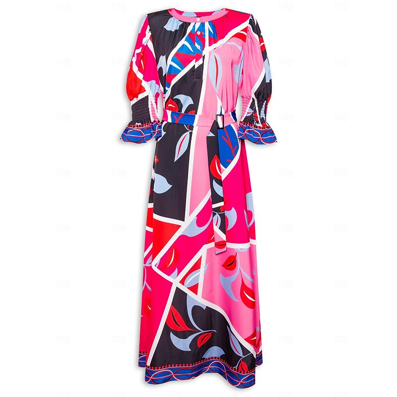 HOT ! Satin Floral Block Print Round Neck Maxi Dress