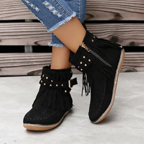 Women's Casual Vintage Fringe Boots Lightweight Comfy Suede High Top Booties Casual Short Booties Side Zip Flat Winter Boot 7